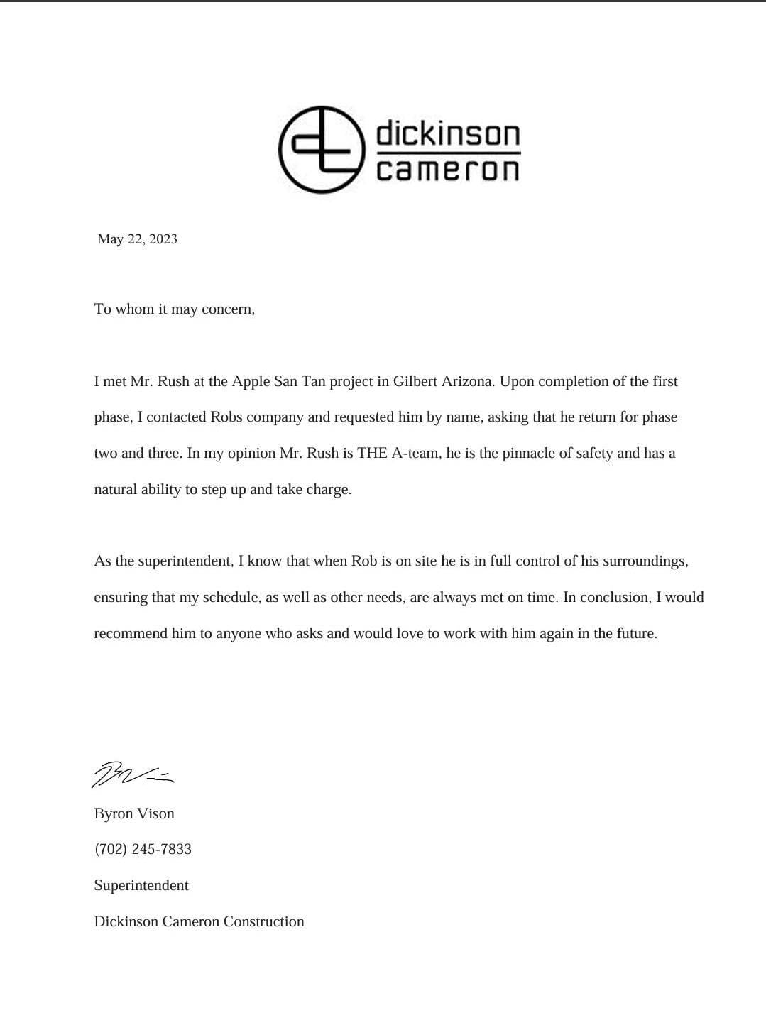 I met Mr. Rush at the Apple San Tan project in Gilbert Arizona. Upon completion of the first phase, I contacted Robs company and requested him by name, asking that he return for phase two and three. In my opinion Mr. Rush is THE A-team, he is the pinnacle of safety and has a natural ability to step up and take charge.